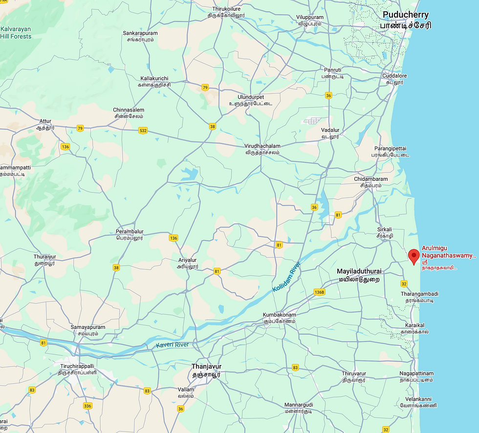 The temple is located 150 km or 3 hours east of Thiruchirapalli and 120 km or 2.5 hours south of Pondicherry. It 25 km or 40 minutes east of Mayiladuthurai and 25 km or 40 minutes north of Tharangambadi. We visited in June 2025. We were based in Kumbakonam.